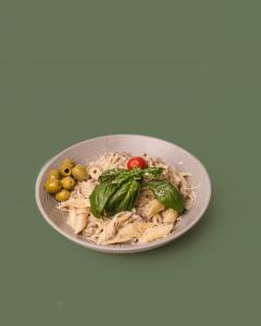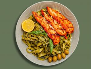 (کالری 949) فتوچینی + 150 گرم فیله مرغ + سس پستو + ریحان ایتالیایی + دورچین سبزیجات