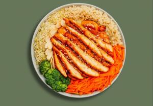 (کالری 380) سینه مرغ گریل + کینوا + کاهو پیچ + بروکلی + بادام + هویج + جوانه + کنجد