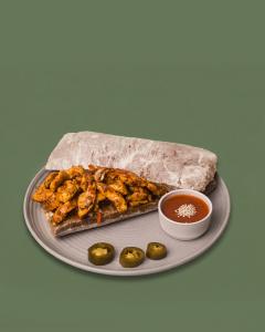 هالوپینو+سس مخصوص گرینا(تند) مغزران پخته و ریش شده گوساله + پنیر پیتزا کم چرب + قارچ + نان (لطفا در قسمت توضیحات نوع نان انتخابی خود را بنویسید: نان جو یا نان چاپاتا)