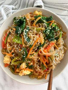 رشته نودل شیشه ای، اسفناج، هویج، قارچ اختیاری، مرغ، فلفل دلمه، پیاز، سس سویا