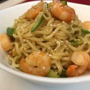 میگو طعم دار،رشته نودل خارجی، سس سویا ،سبزیجات، رب فلفل کره ای ،سیر