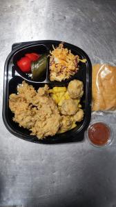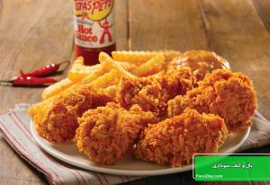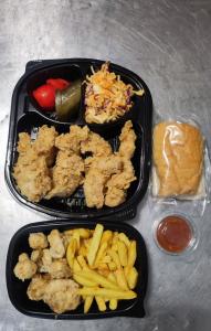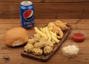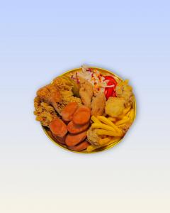 2عدد فیله سوخاری،۲عدد بال و کتف،هات داگ،سیب زمینی،قارچ سوخاری،سالاد کلم،گوجه و خیارشور،نان و سس