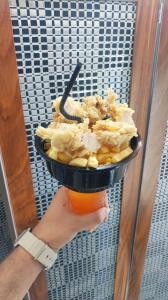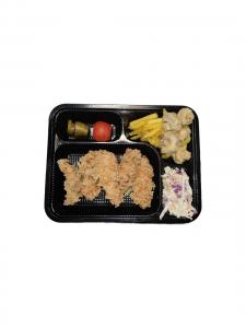 ۱۰۰گرم سیب زمینی،۱۰۰گرم قارچ سوخاری،۱عدد فیله استریپس،سالادکلم،گوجه و خیارشور