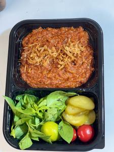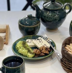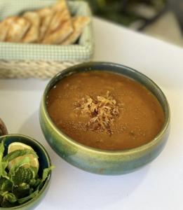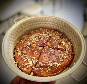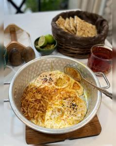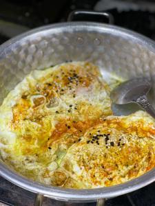 دو عدد تخم مرغ نیمرو شده در کره به همراه پیاز داغ به همراه دورچین و نان