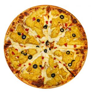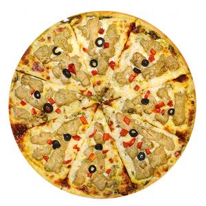 33 سانتی شامل خمیر پیتزا ، سس مارینارا ، فیله مرغ طعم دار شده ، سس قارچ، پنیر پیتزا ، فلفل دلمه ، زیتون