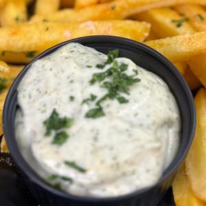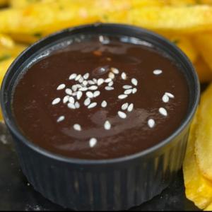 130 گرم چوریتسو 90٪ ذغالی + پنیر ورقه ای + نان گرد سحر + سیب زمینی سرخ کرده + سس