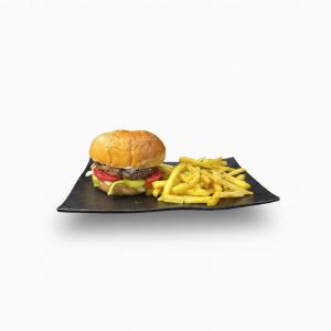 برگر ذغالی 150 گرمی دست ساز گوشت گوساله تازه + 130 گرم چوریتسو 90 ٪ + پنیر ورقه + نان گرد سحر + سیب زمینی + سس