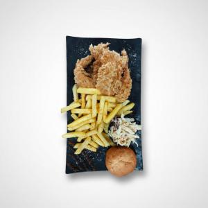 3تیکه فیله مرینیت شده + سیب زمینی+ سالاد کلم+ سس دست ساز + نان بروتچن