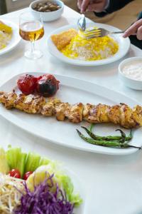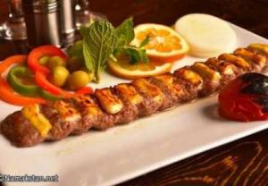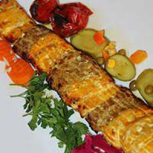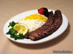2 سیخ کباب نگین دار کوبیده مخلوط گوشت گوسفندی و گوساله 240 گرمی.125 گرم سینه مرغ نگینی.400 گرم برنج 100% ایرانی