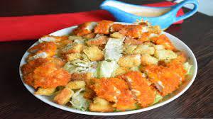 2 عدد فیله مرغ 150 گرمی گریل شده، کاهو پیچ، زیتون سبز، کاپاریس، گوجه گیلاسی،4 عدد نان سوخاری،30گرم پنیر پارمسان،70 گرم سس سزار