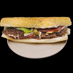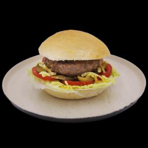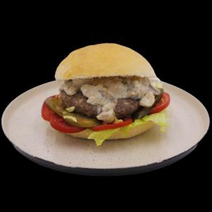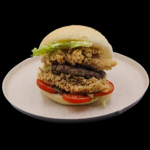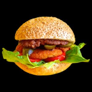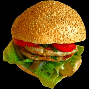 برگر دست ساز فیله مرغ 200 گرمی، پنیر گودا، گوجه، خیارشور، کاهو، کشنیز تازه، نان گرد