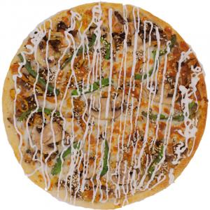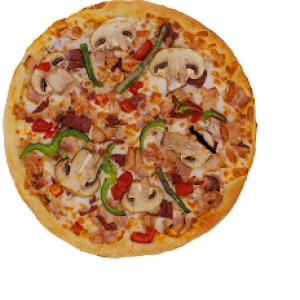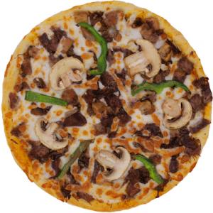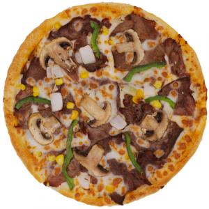 فیله گوشت عمل آوری شده، پنیر موزارلا و پارمسان، مرینار سس، فلفل دلمه، گوجه، ذرت، قارچ،