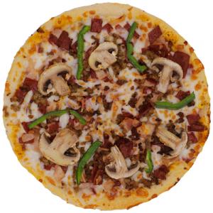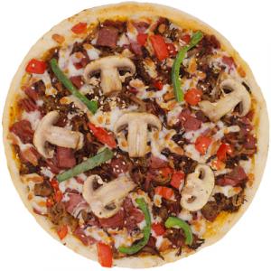 ژامبون گوشت، ژامبون مرغ، گوشت رشته ای، پنیرموزارلا و پارمسان، مرینار سس، فلفل دلمه، گوجه، ، قارچ