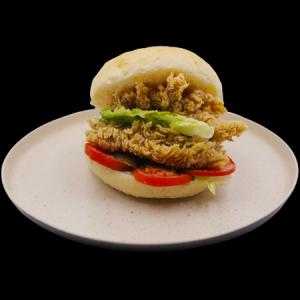 برگر دست ساز فیله مرغ 200 گرمی، گوجه، خیارشور، کاهو، کشنیز تازه، نان گرد
