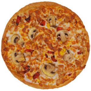 فیله مرغ عمل آوری شده، پنیر موزارلا و پارمسان، مرینار سس، گوجه، ذرت، قارچ،