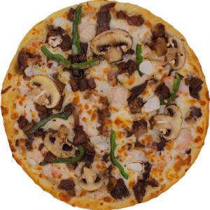 خمیر پیتزا آمریکایی،گوشت فیله گوساله، فیله مرغ ،پنیر پارمسان، پنیر پیتزا موزارلا، سس مرینار، قارچ، فلفل دلمه ای، ذرت، کنجد