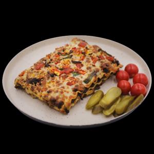 بادمجان، گوشت چرخ کرده، پنیر موزارلا وپارمسان، مرینار سس، روغن سیر، فلفل دلمه، گوجه، قارچ،