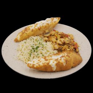 زبان گوساله، فیله مرغ عمل آوری شده، پنیر موزارلا و پارمسان، مرینار سس، فلفل دلمه، قارچ،