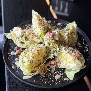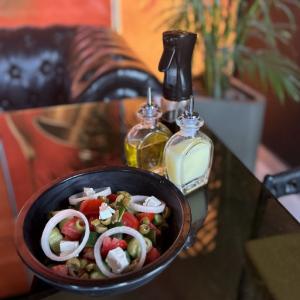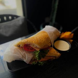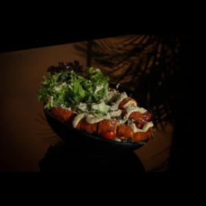 کاهو-روکولا-رول مرغ سوخاري-سس مخصوص-نان تست(سرخ شده)-گوجه گيلاسي-زيتون