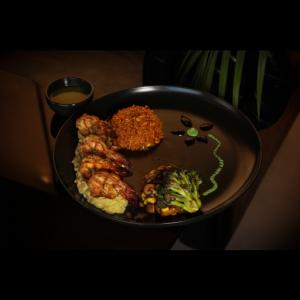 ميگو-سبزيجاته ساته شده-پوره سيب زميني-سس مخصوص-برنج مکزيکي