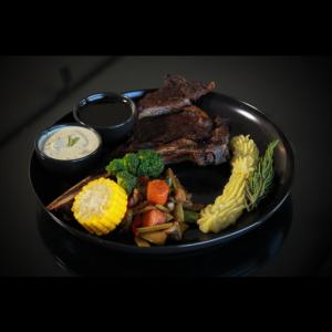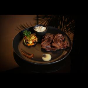دنده گوساله-پياز کاراملايز-سس مخصوص(کاهو-گوجه-خيارشور)