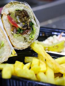 دو عدد کتلت لبنانی (تند) 140 گرمی با پنیر گودا با دورچین سیب زمینی سرخ شده و سالاد کلم و لیمو و، ، ، بصورت پک کامل