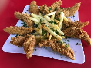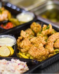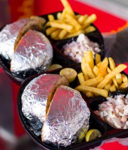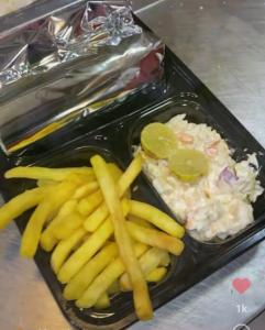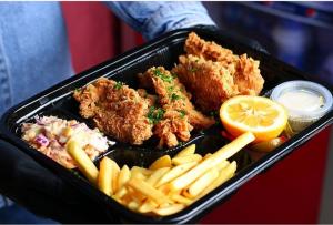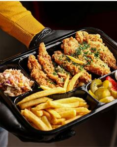 فیله های کوچک شده و تک تکه شده و سوخاری شده به همراه دورچین سیب زمینی سرخ شده و سالاد و لیمو، ، ، بصورت پک کامل