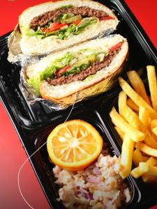 ساندویچ دو عدد کتلت لبنانی (تند) 140 گرمی با پنیر گودا و قارچ سرخ شده با دورچین سیب زمینی سرخ شده و سالاد کلم و لیمو و، ، ، بصورت پک کامل