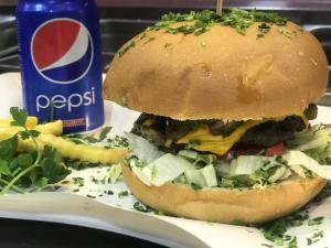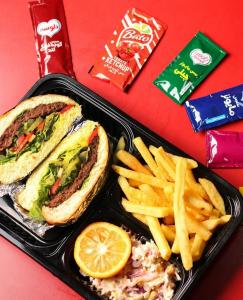 یک عدد همبرگر 130 گرمی با پنیر گودا به همراه دورچین سیب زمینی سرخ شده و سالادو لیمو، ، ، بصورت پک کامل