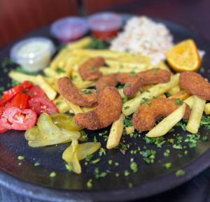 6 تکه ناگت میگو و گوجه و خیارشور با دورچین سیب زمینی سرخ شده و سالاد کلم و، ، ، بصورت پک کامل