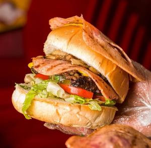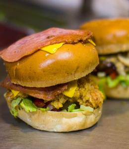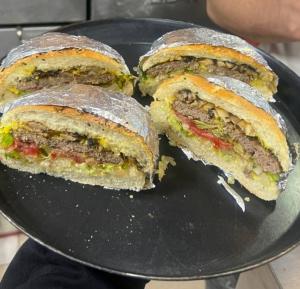 ساندویچ با یک عدد همبرگر ۱۵۰ گرمی دست ساز و یک عدد سینه مرغ + پنیر + ژامبون + قارچ بدون دورچین