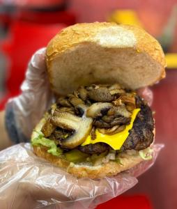 یک عدد همبرگر ۹۵٪ شرکتی مام با قارچ و پنیر بدون دورچین