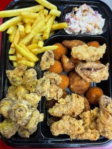 دو عدد بال سوخاری،چهار عدد مرغ پاپ کورنی،سیب زمینی سرخ شده،قارچ سوخاری،چیکن فینگر یا کراکت مرغ چهار عدد،سوسیس پنیری دو عدد،توپک پنیری چهار عدد،سیب زمینی تنوری چهار عدد،سالاد کلم و سس مخصوص و سس تک نفره