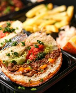 ساندویچ بدون نان، غذای دو نفره، دو عدد سینه سوخاری و یک عدد همبرگر ذغالی 125 گرمی دست ساز و یک عدد سینه کبابی و پنیر گودا و ژامبون با سس سبزیجات به همراه دورچین سالاد، سیب زمینی سرخ شده، لیمو و، ، ، ، بصورت پک کامل مناسب برای دو نفر