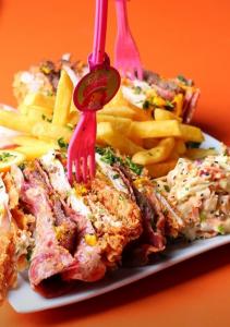 ساندویچ بدون نان، دو عدد سینه سوخاری به همراه یک عدد سینه کبابی و پنیر گودا و ژامبون با سس سبزیجات با دورچین سالاد، سیب زمینی سرخ شده، زیتون و لیمو و، ، ، بصورت پک کامل مناسب برای دو نفر