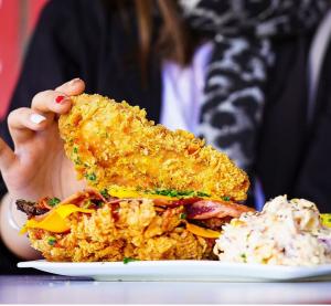 ساندویچ بدون نان، دو عدد سینه سوخاری، ژامبون، پنیر، با دورچین سیب زمینی سرخ شده و سالاد کلم و لیمو و، ، ، ، ، ، بصورت پک کامل