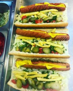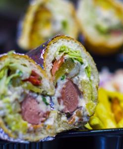 سوسیس بندری،قارچ سرخ شده،پنیر پیتزا،کاهو،گوجه،خیارشور،جعفری خرد شده
