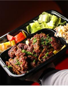 یک عدد کتلت گوشت 140 گرمی و یک عدد کتلت لبنانی 140 گرمی با پنیر گودا و قارچ سرخ شده با دورچین سیب زمینی سرخ شده و سالاد کلم و لیمو و، ، ، بصورت پک کامل مناسب برای دو نفر