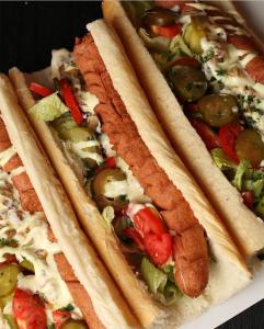 ساندویچ بدون نان، دو عدد سینه سوخاری به همراه هات داگ و پنیر گودا و ژامبون با سس سبزیجات بادورچین سالادو سیب زمینی سرخ شده و لیمو و، ، ، ، بصورت پک کامل مناسب برای دو نفر