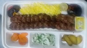 ترکیب گوشت گوساله و گوسفندی دو سیخ کباب (حدود 280گرم) همراه بادورچین