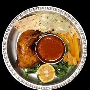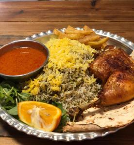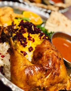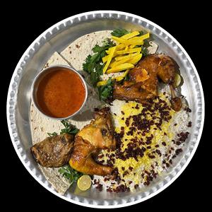 یک پرس برنج ایرانی درجه یک +یک عدد ران کامل سرخ شده (400گرم) به همراه سس مخصوص