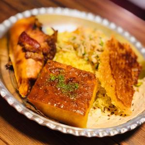 جمعه ها - 250 گرم ماهیچه تازه و گرم گوساله، یک پرس برنج گیلان درجه یک شیرین بهمراه خلال پسته بادام و یک برش کوکو شیرین زعفرونی