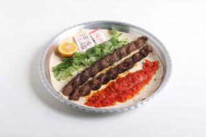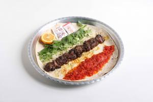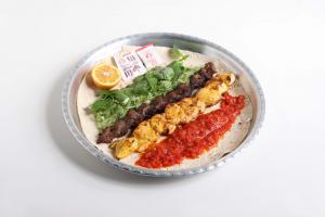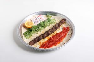 یک سیخ کوبیده،یک سیخ جوجه، نان، پیاز، جعفری، ریحون، سس گوجه، کره،۳ورق پنیر ورقه گودا