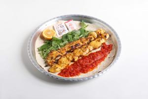 یک سیخ ۲۰۰ گرمی جوجه ترش، گوجه، پیازجعفری، ریحان، نان، کده