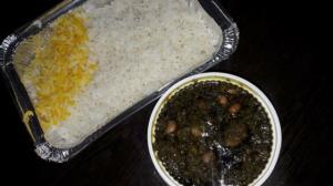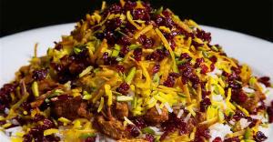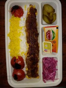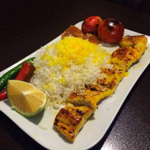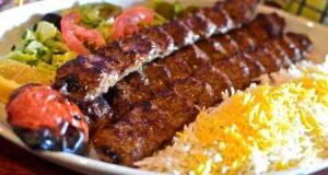 برنج ایرانی ا سیخ جوجه و ۱ سیخ کوبیده با گوشت گرم قلوه گاه گوسفندی و گاوی