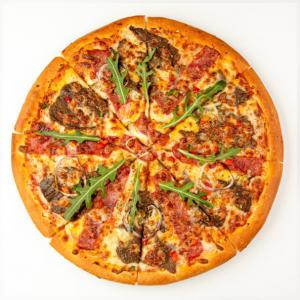 استيک گوشت+مرغ کبابي+بيکن+پپروني+سوسيس انگشتي+پنير+قارچ+فلفل دلمه+زيتون سياه