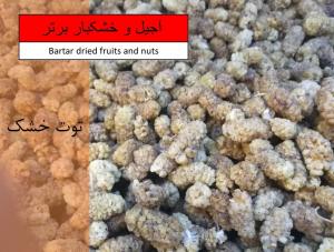توت خشک، مویز ترک، انجیر، کشمش سبز، پسته، مغز بادام، مغز گردو، بادام هندی .انجیر