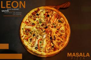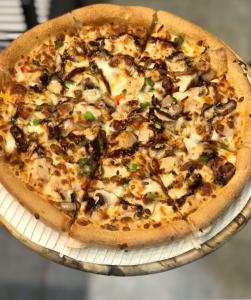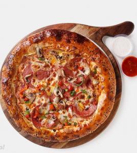 ژامبون گوشت و مرغ، پپرونی، قارچ، فلفل دلمه ای، زیتون، پنیر موزارلا، سس مخصوص