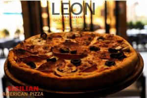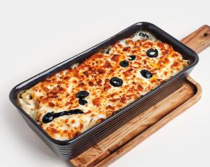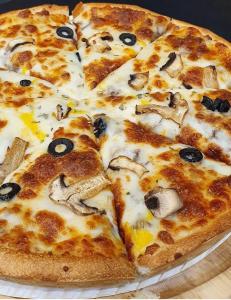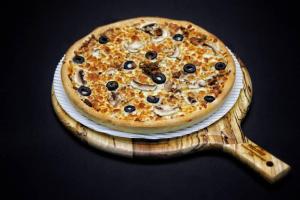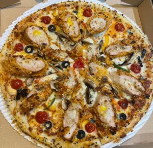 فیله مرغ سوخاری با پنیر، قارچ، فلفل دلمه، گوجه فرنگی، زیتون، پنیر میکس، سس گوجه فرنگی