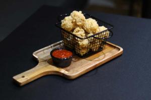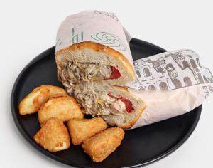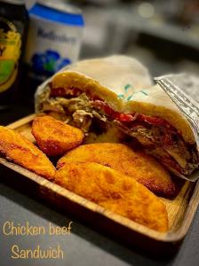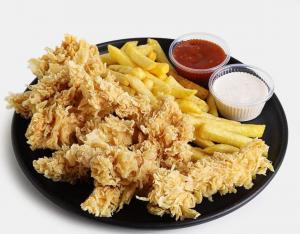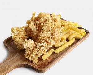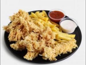 2 عدد فیله مرغ + 1 عدد رول سوخاری + قارچ سوخاری + سیب زمینی + نان